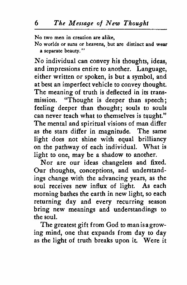 No individual can convey his thoughts, ideas, and impressions entire to another. Language, either written or spoken, is but a symbol, and at best an imperfect vehicle to convey thought. The meaning of truth is deflected in its transmission. "Thought is deeper than speech; feeling deeper than thought; souls to souls can never teach what to themselves is taught." The mental and spiritual visions of man differ as the stars differ in magnitude. The same light does not shine with equal brilliancy on the pathway of each individual. What is light to one, may be a shadow to another.