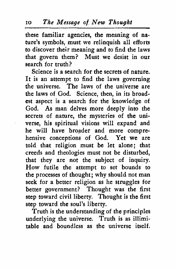 Science is a search for the secrets of Nature. It is an attempt to find the laws governing the universe. The laws of the universe are the laws of God. Science, then, in its broadest aspect is a search for the knowledge of God. As man delves more deeply into the secrets of Nature, the mysteries of the universe, his spiritual visions will expand and he will have broader and more comprehensive conceptions of God. Yet we are told that religion must be let alone; that creeds and theologies must not be disturbed, that they are not the subject of inquiry. How futile the attempt to set bounds to the processes of thought; why should not man seek for a better religion as he struggles for better government? Thought was the first step toward civil liberty. Thought is the first step toward the soul's liberty.