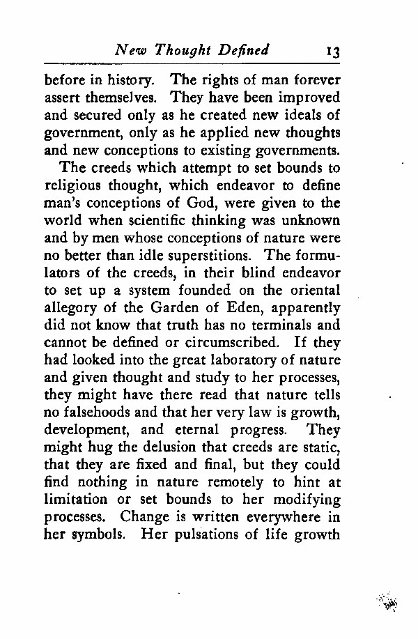The creeds which attempt to set bounds to religious thought, which endeavor to define man's conceptions of God, were given to the world when scientific thinking was unknown and by men whose conceptions of Nature were no better than idle superstitions. The formulators of the creeds, in their blind endeavor to set up a system founded on the oriental allegory of the Garden of Eden, apparently did not know that truth has no terminals and cannot be defined or circumscribed. If they had looked into the great laboratory of Nature and given thought and study to her processes, they might have there read that Nature tells no falsehoods and that her very law is growth, development, and eternal progress. They might hug the delusion that creeds are static, that they are fixed and final, bur they could find nothing in Nature remotely to hint at limitation or set bounds to her modifying processes. Change is written everywhere in her symbols. Her pulsations of life growth