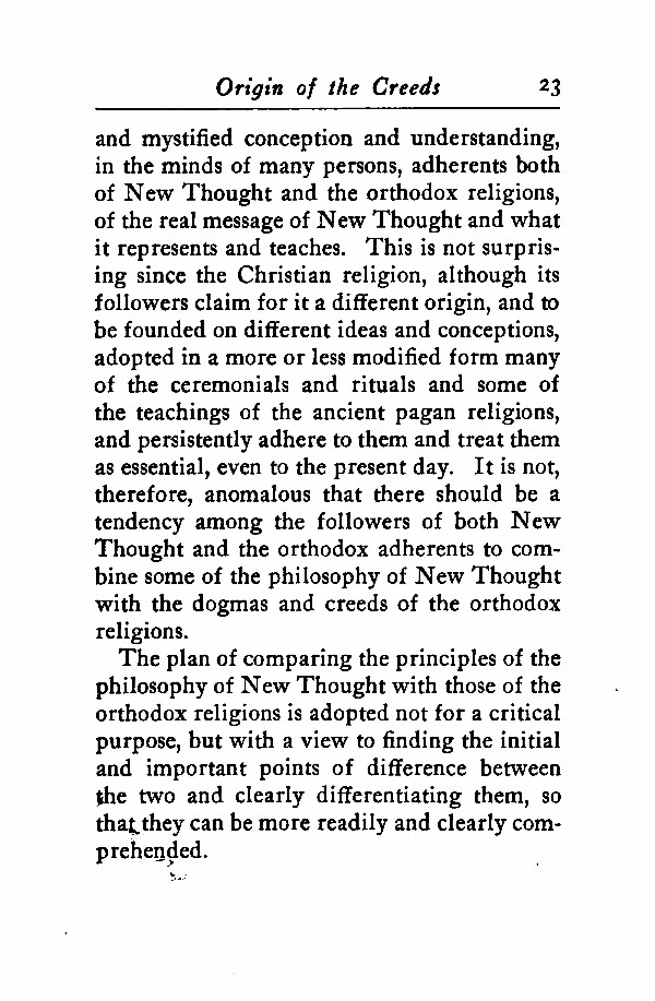 The plan of comparing the principles of the philosophy of New Thought with those of the orthodox religions is adopted not for a critical purpose, but with a view to finding the initial and important points of difference between the two and clearly differentiating them, so that they can be more readily and clearly comprehended.