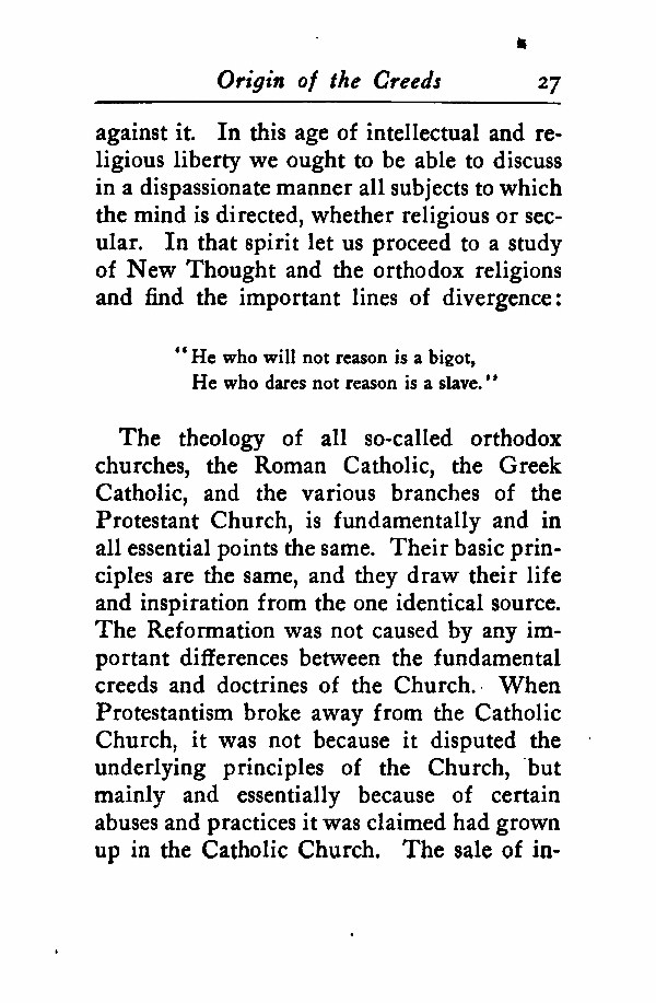against it. In this age of intellectual and religious liberty we ought to be able to discuss in a dispassionate manner all subjects to which the mind is directed, whether religious or secular. In that spirit let us proceed to a study of New Thought and the orthodox religions and find the important lines of divergence: "He who will not reason is a bigot, He who dares not reason is a stave."