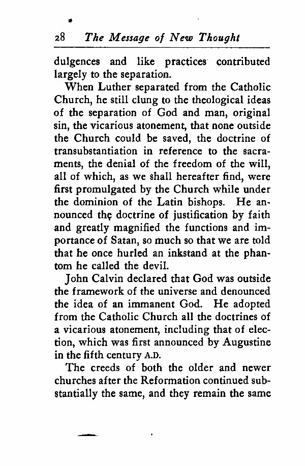 When Luther separated from the Catholic Church, he still clung to the theological ideas of the separation of God and man, original sin, the vicarious atonement, that none outside the Church could be saved, the doctrine of transubstantiation in reference to the sacraments, the denial of the freedom of the will, all of which, as we shall hereafter find, were first promulgated by the Church while under the dominion of the Latin bishops. He announced the doctrine of justification by faith and greatly magnified the functions and importance of Satan, so much so that we are told that he once hurled an inkstand at the phantom he called the devil.