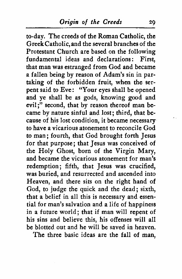 today. The creeds of the Roman Catholic, the Greek Catholic, and the several branches of the Protestant Church are based on the following fundamental ideas and declarations: First, that man was estranged from God and became a fallen being by reason of Adam's sin in partaking of the forbidden fruit, when the serpent said to Eve: "Your eyes shall be opened and ye shall be as gods, knowing good and evil;" second, that by reason thereof man became by nature sinful and lost; third, that because of his lost condition, it became necessary to have a vicarious atonement to reconcile God to man; fourth, that God brought forth Jesus for that purpose; that Jesus was conceived of the Holy Ghost, born of the Virgin Mary, and became the vicarious atonement for man's redemption; fifth, that Jesus was crucified, was buried, and resurrected and ascended into Heaven, and there sits on the right hand of God,to judge the quick and the dead; sixth, that a belief in all this is necessary and essential for man's salvation and a life of happiness in a future world; that if man will repent of his sins and believe this, his offenses will all be blotted out and he will be saved in heaven.