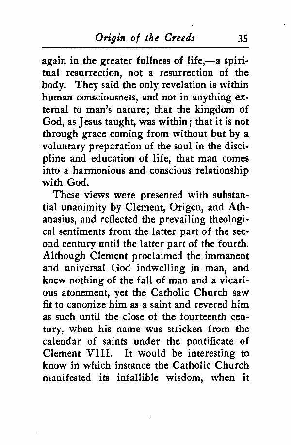 These views were presented with substantial unanimity by Clement, Origen, and Athanasius, and reflected the prevailing theological sentiments from the latter part of the second century until the latter part of the fourth. Although Clement proclaimed the immanent and universal God indwelling in man, and knew nothing of the fall of man and a vicarious atonement, yet the Catholic Church saw fit to canonize him as a saint and revered him as such until the close of the fourteenth century, when his name was stricken from the calendar of saints under the pontificate of Clement VIII. It would be interesting to know in which instance the Catholic Church manifested its infallible wisdom, when it