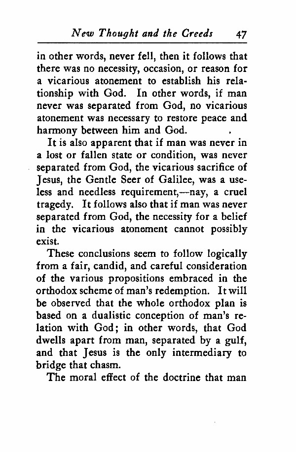 These conclusions seem to follow logically from a fair, candid, and careful consideration of the various propositions embraced in the orthodox scheme of man's redemption. It will be observed that the whole orthodox plan is based on a dualistic conception of man's relation with God; in other words, that God dwells apart from man, separated by a gulf, and that Jesus is the only intermediary to bridge that chasm.