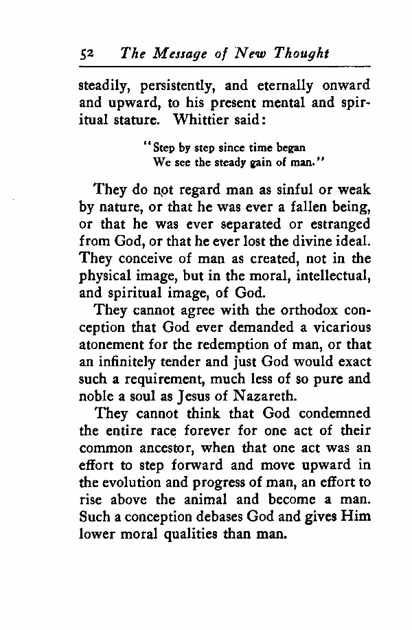 They do not regard man as sinful or weak by nature, or that he was ever a fallen being, or that he was ever separated or estranged from God, or that he ever lost the divine ideal. They conceive of man as created, not in the physical image, but in the moral, intellectual, and spiritual image, of God.