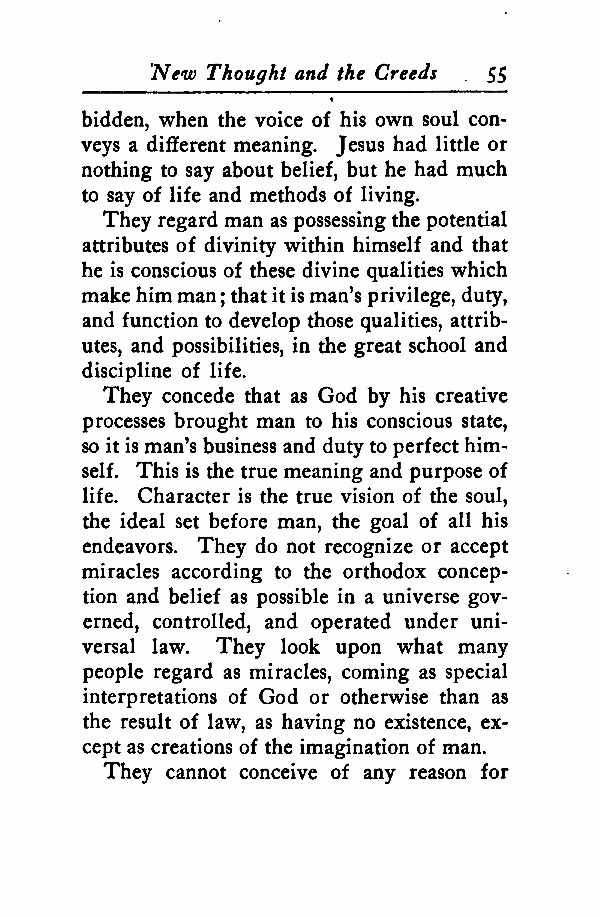 They concede that as God by His creative processes brought man to his conscious state, so it is man's business and duty to perfect himself. This is the true meaning and purpose of life. Character is the true vision of the soul, the ideal set before man, the goal of all his endeavors. They do not recognize or accept miracles according to the orthodox conception and belief as possible in a universe governed, controlled, and operated under universal law. They look upon what many people regard as miracles, coming as special interpretations of God or otherwise than as the result of law, as having no existence, except as creations of the imagination of man.