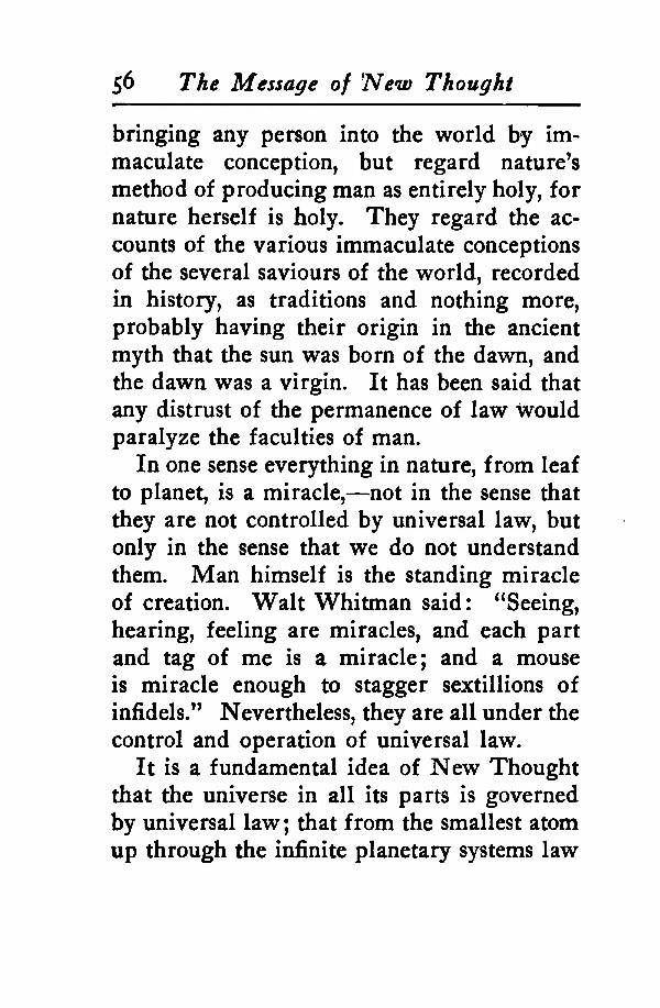 In one sense everything in Nature, from leaf to planet, is a miracle,--not in the sense that they are not controlled by universal law, but only in the sense that we do not understand them. Man himself is the standing miracle of creation. Walt Whitman said: "Seeing, hearing, feeling are miracles, and each part and tag of me is a miracle; and a mouse is miracle enough to stagger sextillions of infidels." Nevertheless, they are all under the control and operation of universal law.