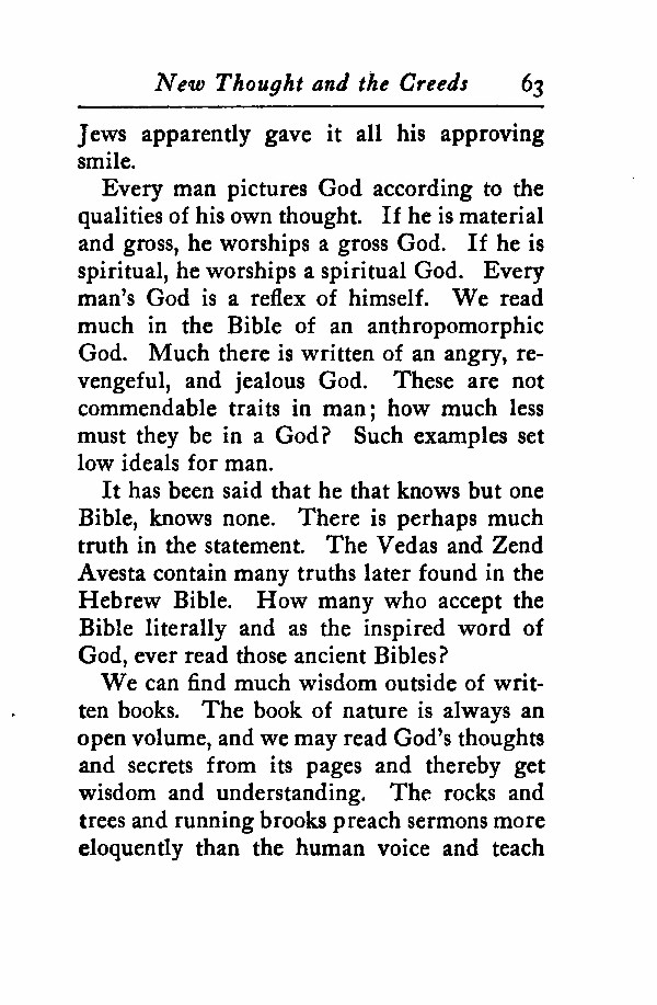Every man pictures God according to the qualities of his own thought. If he is material and gross, he worships a gross God. If he is spiritual, he worships a spiritual God. Every man's God is a reflex of himself. We read much in the Bible of an anthropomorphic God. Much there is written of an angry, revengeful, and jealous God. These are not commendable traits in man; how much less must they be in a God? Such examples set low ideals for man.