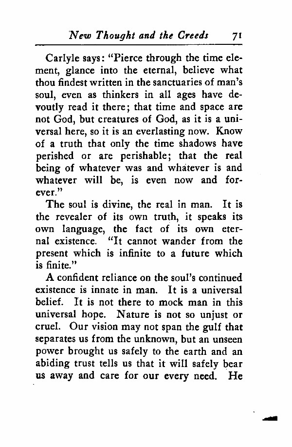 Carlyle says: "Pierce through the time element, glance into the eternal, believe what thou findest written in the sanctuaries of man's soul, even as thinkers in all ages have devoutly read it there; that time and space are not God, but creatures of God, as it is a universal here, so it is an everlasting now. Know of a truth that only the time shadows have perished or are perishable; that the real being of whatever was and whatever is and whatever will be, is even now and forever."