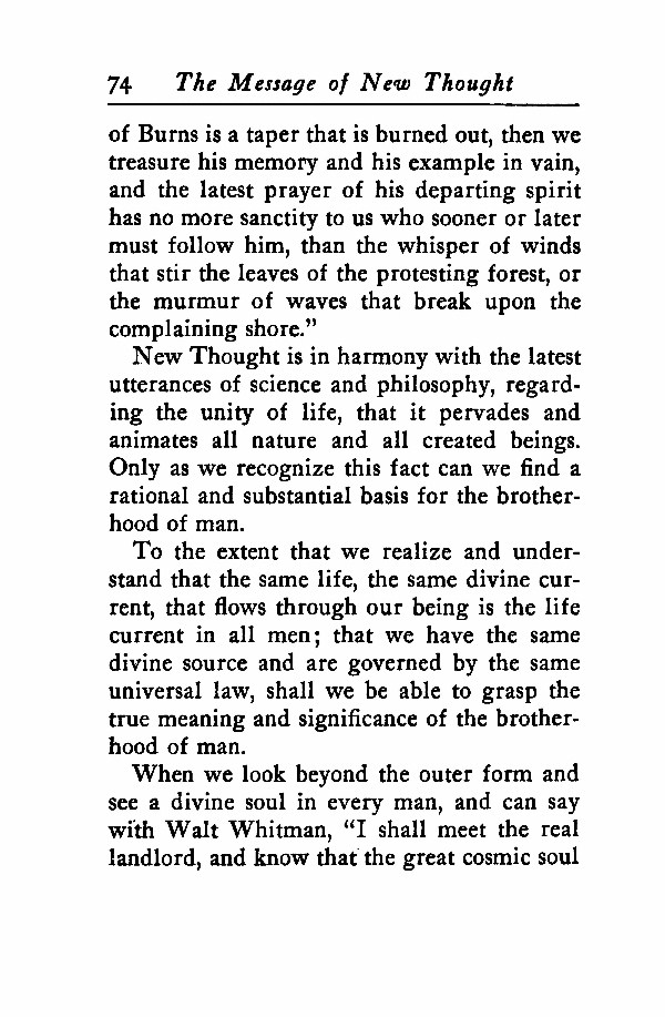 New Thought is in harmony with the latest utterances of science and philosophy, regarding the unity of life, that it pervades and animates all nature and all created beings. Only as we recognize this fact can we find a rational and substantial basis for the brotherhood of man.