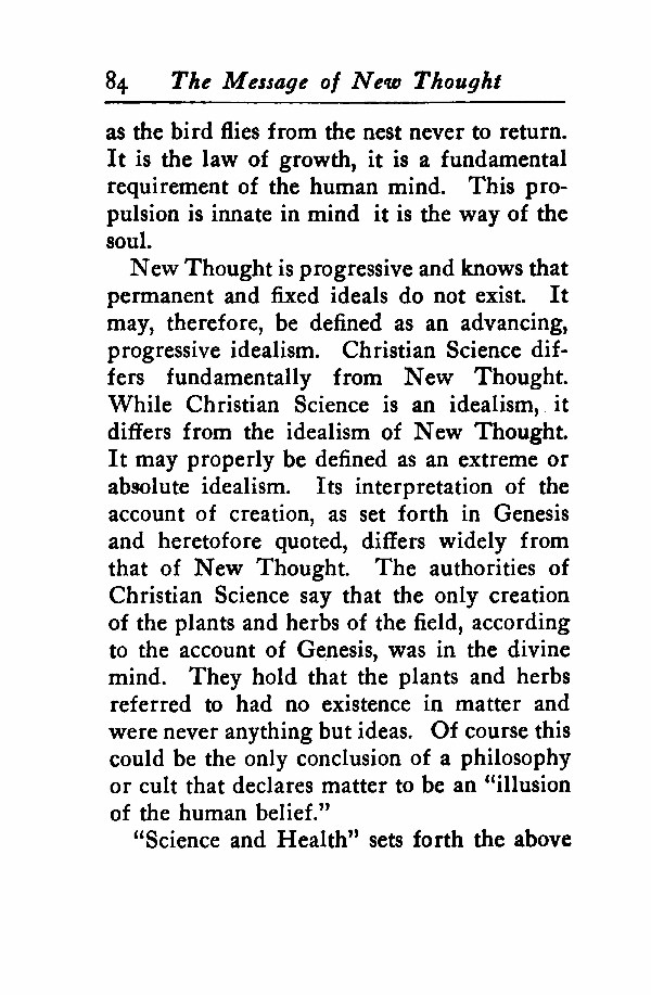 New Thought is progressive and knows that permanent and fixed ideals do not exist. It may, therefore, be defined as an advancing, progressive idealism. Christian Science differs fundamentally from New Thought. While Christian Science is an idealism, it differs from the idealism of New Thought. It may properly be defined as an extreme or absolute idealism. Its interpretation of the account of creation, as set forth in Genesis and heretofore quoted, differs widely from that of New Thought. The authorities of Christian Science say that the only creation of the plants and herbs of the field, according to the account of Genesis, was in the Divine Mind. They hold that the plants and herbs referred to had no existence in matter and were never anything but ideas. Of course this could be the only conclusion of a philosophy or cult that declares matter to be an "illusion of the human belief."