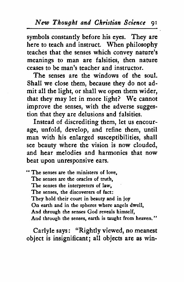 The senses are the windows of the soul. Shall we close them, because they do not admit all the light, or shall we open them wider, that they may let in more light? We cannot improve the senses, with the adverse suggestion that they are delusions and falsities.