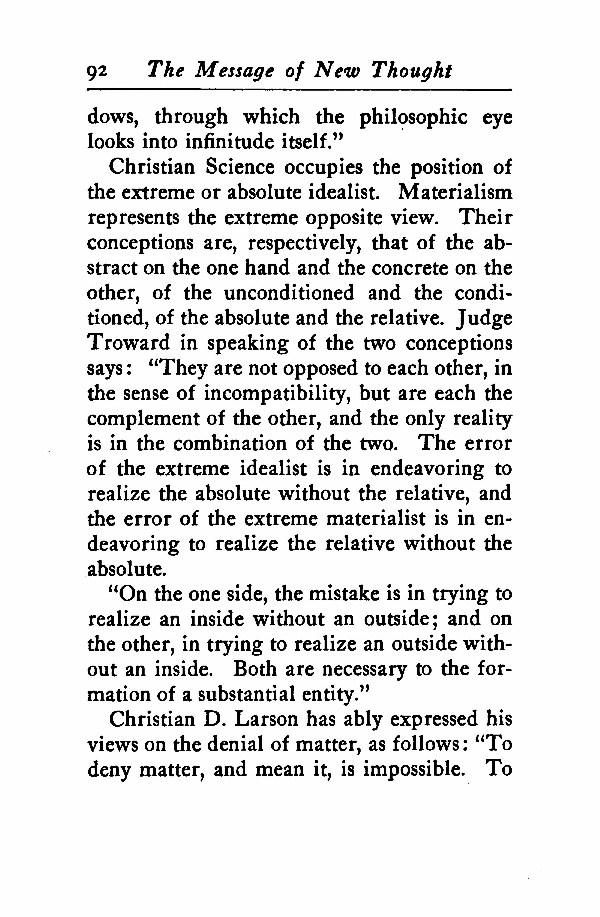 Christian Science occupies the position of the extreme or absolute idealist. Materialism represents the extreme opposite view. Their conceptions are, respectively, that of the abstract on the one hand and the concrete on the other, of the unconditioned and the conditioned, of the absolute and the relative. Judge Troward in speaking of the two conceptions says: "They are not opposed to each other, in the sense of incompatibility, but are each the complement of the other, and the only reality is in the combination of the two. The error of the extreme idealist is in endeavoring to realize the absolute without the relative. and the error of the extreme materialist is in endeavoring to realize the relative without the absolute.