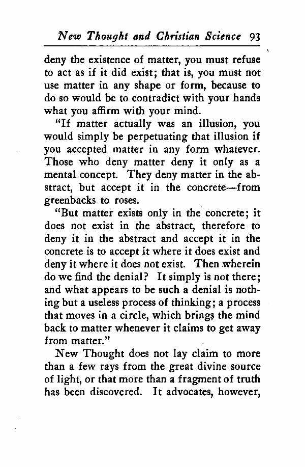 New Thought does not lay claim to more than a few rays from the great divine source of light, or that more than a fragment of truth has been discovered. It advocates, however,