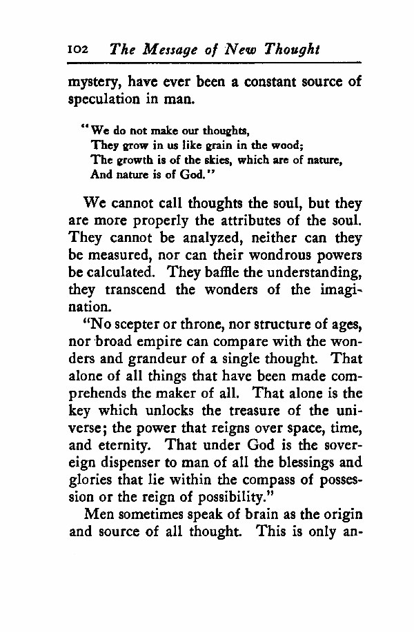 "No scepter or throne, nor structure of ages, nor broad empire can compare with the wonders and grandeur of a single thought. That alone of all things that have been made comprehends the maker of all. That alone is the key which unlocks the treasure of the universe; the power that reigns over space, time, and eternity. That under God is the sovereign dispenser to man of all the blessings and glories that lie within the compass of possession or the reign of possibility."