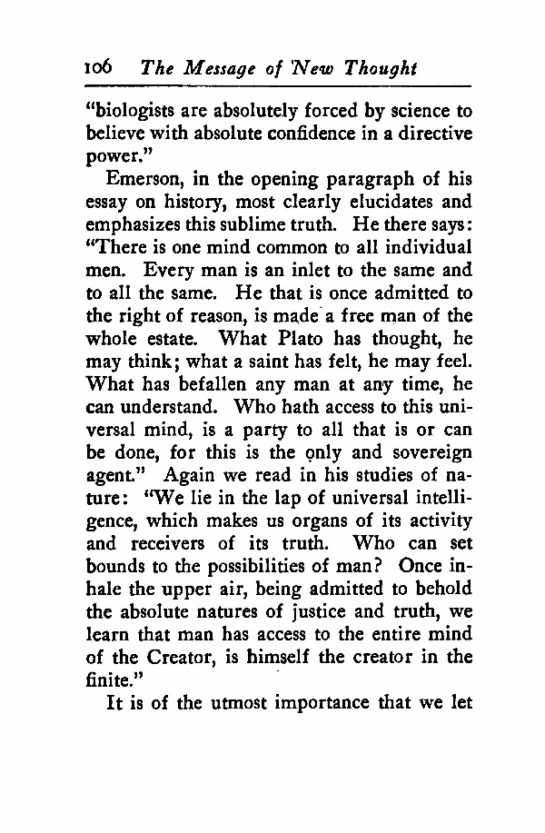 Emerson, in the opening paragraph of his essay on history, most clearly elucidates and emphasizes this sublime truth. He there says: "There is one mind common to all individual men. Every man is an inlet to the same and to all the same. He that is once admitted to the right of reason, is made a free man of the whole estate. What Plato has thought, he may think; what a saint has felt, he may feel. What has befallen any man at any time, he can understand. Who hath access to this universal mind, is a party to all that is or can be done, for this is the only and sovereign agent." Again we read in his studies of Nature: "We lie in the lap of universal intelligence, which makes us organs of its activity and receivers of its truth. Who can set bounds to the possibilities of man? Once inhale the upper air, being admitted to behold the absolute natures of justice and truth, we learn that man has access to the entire mind of the Creator, is himself the creator in the finite."
