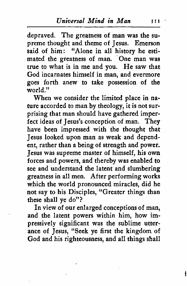 When we consider the limited place in Nature accorded to man by theology, it is not surprising that man should have gathered imperfect ideas of Jesus's conception of man. They have been impressed with the thought that Jesus looked upon man as weak and dependent, rather than a being of strength and power. Jesus was supreme master of himself, his own forces and powers, and thereby was enabled to see and understand the latent and slumbering greatness in all men. After performing works which the world pronounced miracles, did he not say to his Disciples, "Greater things than these shall ye do"?