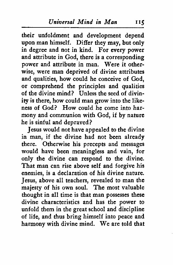 their unfoldment and development depend upon man himself. Differ they may, but only in degree and not in kind. For every power and attribute in God, there is a corresponding power and attribute in man. Were it otherwise, were man deprived of divine attributes and qualities, how could he conceive of God or comprehend the principles and qualities of the Divine Mind? Unless the seed of divinity is there, how could man grow into the likeness of God? How could he come into harmony and communion with God, if by nature he is sinful and depraved?