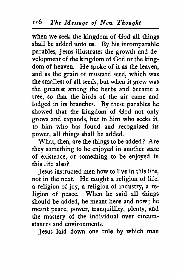 Jesus instructed men how to live in this life, not in the next. He taught a religion of life, a religion of joy, a religion of industry, a religion of peace. When he said all things should be added, he meant here and now; he meant peace, power, tranquillity, plenty, and the mastery of the individual over circumstances and environments.