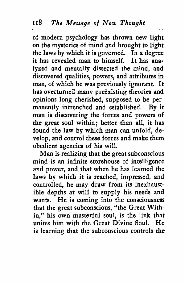 Man is realizing that the great subconscious mind is an infinite storehouse of intelligence and power, and that when he has learned the laws by which it is reached, impressed, and controlled, he may draw from its inexhaustible depths at will to supply his needs and wants. He is coming into the consciousness that the great subconscious, "the Great Within," his own masterful soul, is the link that unites him with the Great Divine Soul. He is learning that the subconscious controls the