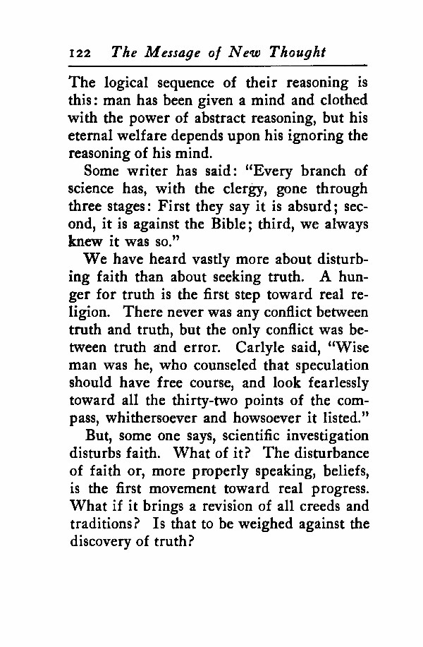 But, someone says, scientific investigation disturbs faith. What of it? The disturbance of faith or, more properly speaking, beliefs, is the first movement toward real progress. What if it brings a revision of all creeds and traditions? Is that to be weighed against the discovery of truth?