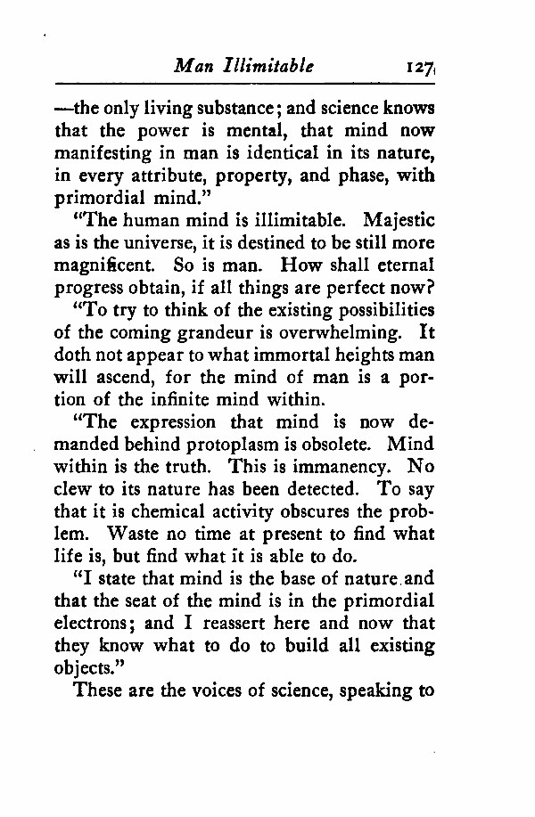 --the only living substance; and science knows that the power is mental, that mind now manifesting in man is identical in its nature, in every attribute, property, and phase, with primordial mind.