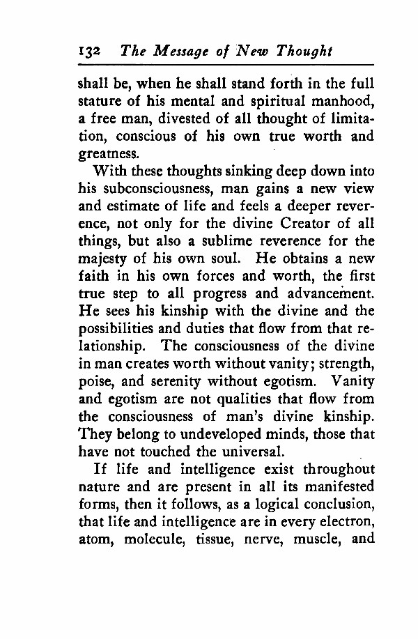 With these thoughts sinking deep down into his subconsciousness, man gains a new view and estimate of life and feels a deeper reverence, not only for the divine Creator of all things, but also a sublime reverence for the majesty of his own soul. He obtains a new faith in his own forces and worth, the first true step to all progress and advancement. He sees his kinship with the divine and the possibilities and duties that flow from that relationship. The consciousness of the divine in man creates worth without vanity; strength, poise, and serenity without egotism. Vanity and egotism are not qualities that flow from the consciousness of man's divine kinship. They belong to undeveloped minds, those that have not touched the universal.