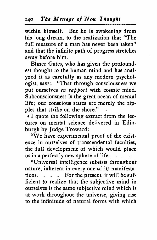 Elmer Gates, who has given the profoundest thought to the human mind and has analyzed it as carefully as any modern psychologist, says: "That through consciousness we put ourselves en rapport with cosmic mind. Subconsciousness is the great ocean of mental life; our conscious states are merely the ripples that strike on the shore."