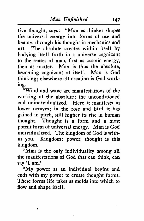 "Wind and wave are manifestations of the working of the absolute; the unconditioned and unindividualized. Here it manifests in lower octaves; in the rose and bird it has gained in pitch, still higher its rise in human thought. Thought is a form and a most potent form of universal energy. Man is God individualized. The kingdom of God is within you. Kingdom: power, thought is this kingdom.
