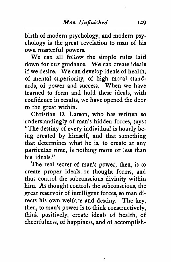 Christian D. Larson, who has written so understandingly of man's hidden forces, says: "The destiny of every individual is hourly being created by himself, and that something that determines what he is, to create at any particular time, is nothing more or less than his ideals."