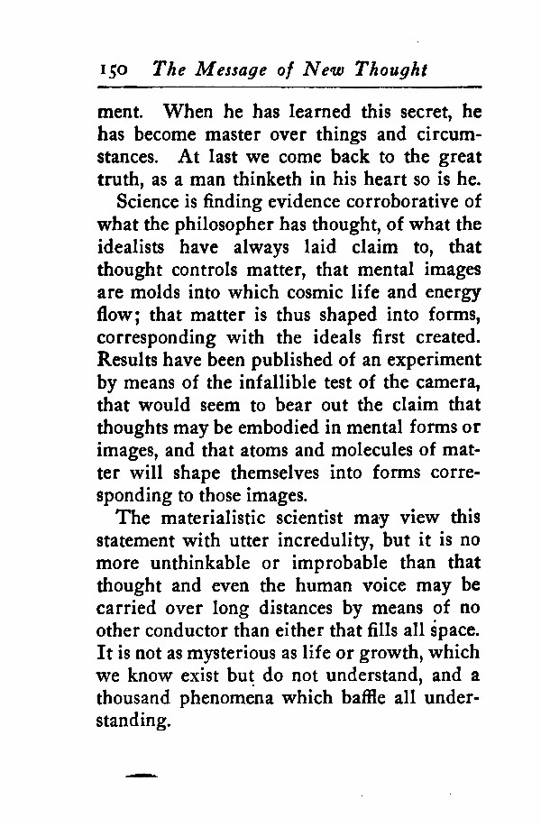 The materialistic scientist may view this statement with utter incredulity, but it is no more unthinkable or improbable than that thought and even the human voice may be carried over long distances by means of no other conductor than either that fills all space. It is not as mysterious as life or growth, which we know exist but do not understand and a thousand phenomena which baffle all understanding.