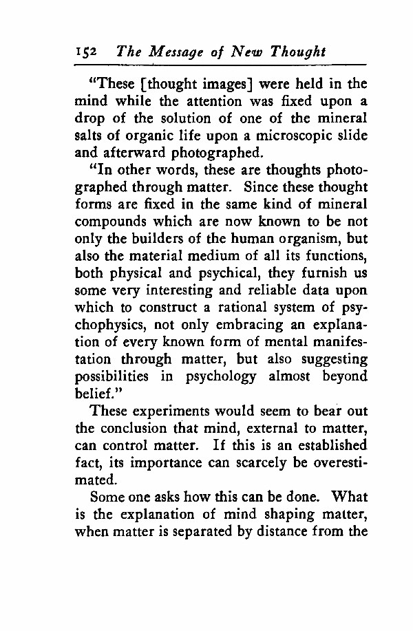 "In other words, these are thoughts photographed through matter. Since these thought forms are fixed in the same kind of mineral compounds which are now known to be not only the builders of the human organism, but also the material medium of all its functions, both physical and psychical, they furnish us some very interesting and reliable data upon which to construct a rational system of psychophysics, not only embracing an explanation of every known form of mental manifestation through matter, but also suggesting possibilities in psychology almost beyond belief."