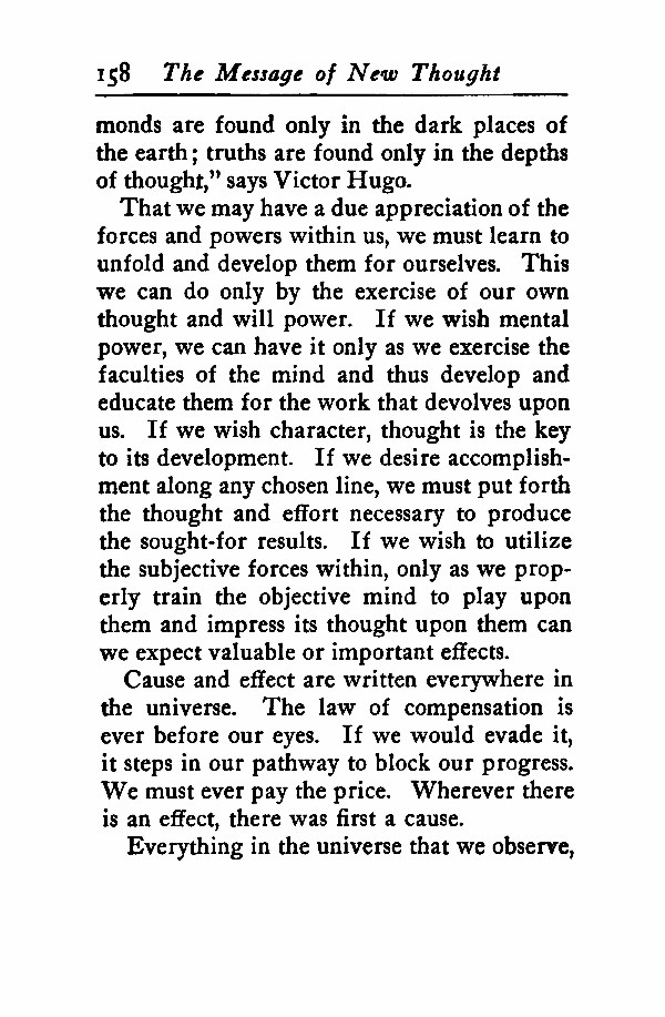 That we may have a due appreciation of the forces and powers within us, we must learn to unfold and develop them for ourselves. This we can do only by the exercise of our own thought and will power. If we wish mental power, we can have it only as we exercise the faculties of the mind and thus develop and educate them for the work that devolves upon us. If we wish character, thought is the key to its development. If we desire accomplishment along any chosen line, we must put forth the thought and effort necessary to produce the sought-for results. If we wish to utilize the subjective forces within, only as we properly train the objective mind to play upon them and impress its thought upon them can we expect valuable or important effects.