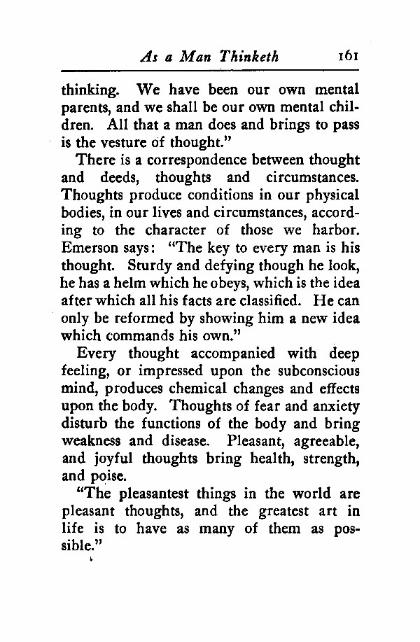 There is a correspondence between thought and deeds, thoughts and circumstances. Thoughts produce conditions in our physical bodies, in our lives and circumstances, according to the character of those we harbor. Emerson says: "The key to every man is his thought. Sturdy and defying though he look, he has a helm which he obeys, which is the idea after which all his facts are classified. He can only be reformed by showing him a new idea which commands his own,"