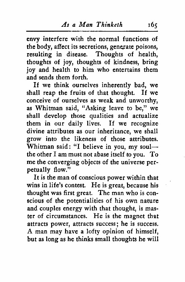If we think ourselves inherently bad, we shall reap the fruits of that thought. If we conceive of ourselves as weak and unworthy, as Whitman said, "Asking leave to be," we shall develop those qualities and actualize them in our daily lives. If we recognize divine attributes as our inheritance, we shall grow into the likeness of those attributes. Whitman said: "I believe in you, my soul--the other I am must not abase itself to you. To me the converging objects of the universe perpetually flow."