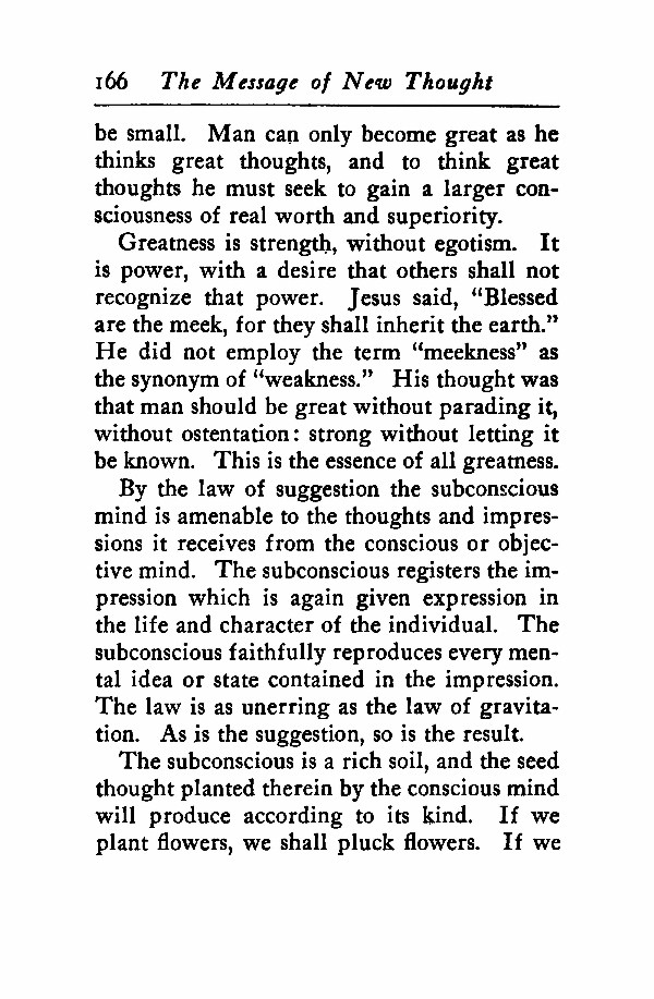 Greatness is strength, without egotism. It is power, with a desire that others shall not recognize that power. Jesus said, "Blessed are the meek, for they shall inherit the earth." He did not employ the term "meekness" as the synonym of "weakness." His thought was that man should be great without parading it, without ostentation: strong without letting it be known. This is the essence of all greatness.