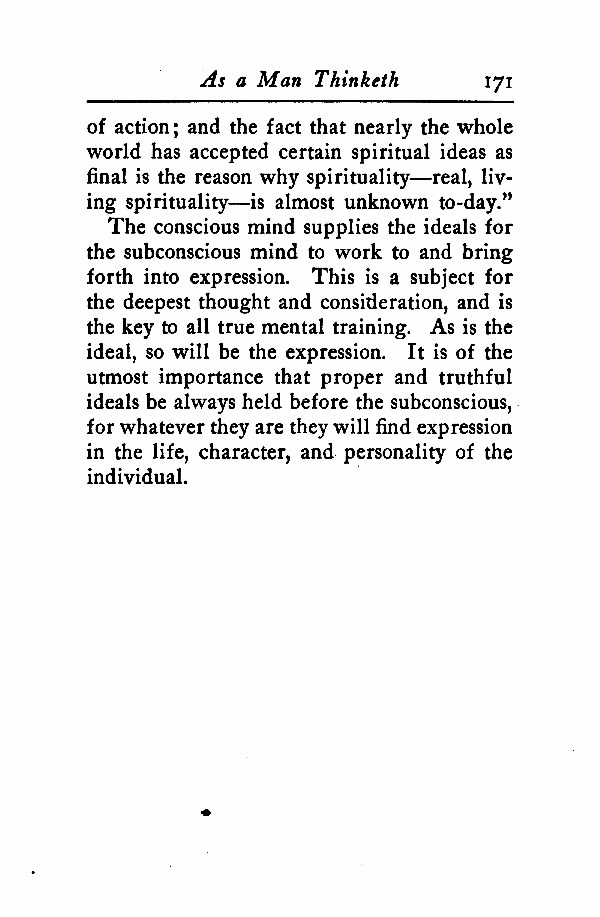 The conscious mind supplies the ideals for the subconscious mind to work to and bring forth into expression. This is a subject for the deepest thought and consideration, and is the key to all true mental training. As is the ideal, so will be the expression. It is of the utmost importance that proper and truthful ideals be always held before the subconscious, for whatever they are they will find expression in the life, character, and personality of the individual.