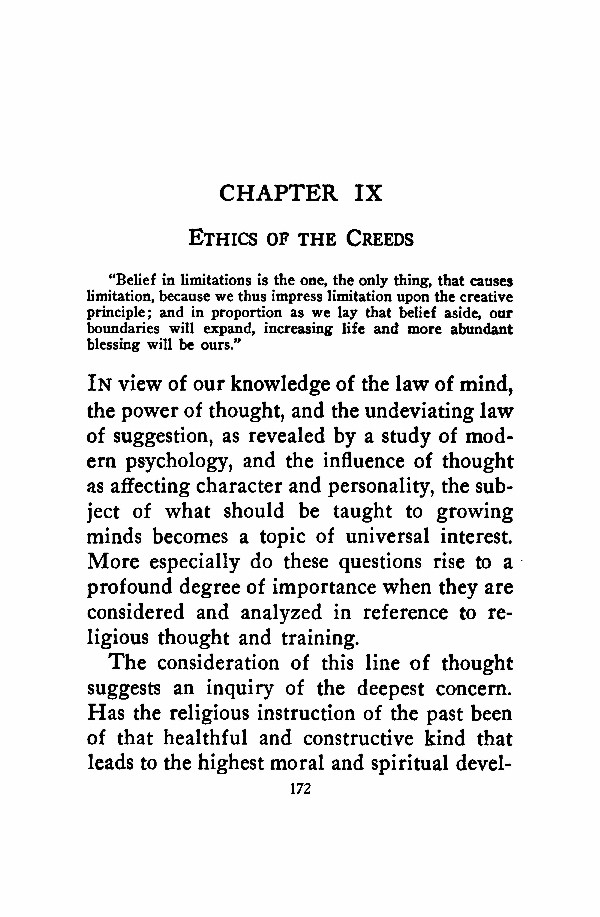 IN view of our knowledge of the law of mind, the power of thought, and the undeviating law of suggestion, as revealed by a study of modern psychology, and the influence of thought as affecting character and personality, the subject of what should be taught to growing minds becomes a topic of universal interest. More especially do these questions rise to a profound degree of importance when they are considered and analyzed in reference to religious thought and training.