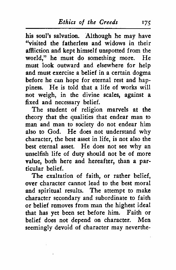his soul's salvation. Although he may have "visited the fatherless and widows in their affliction and kept himself unspotted from the world," he must do something more. He must look outward and elsewhere for help and must exercise a belief in a certain dogma before he can hope for eternal rest and happiness. He is told that a life of works will not weigh, in the divine scales, against a fixed and necessary belief.