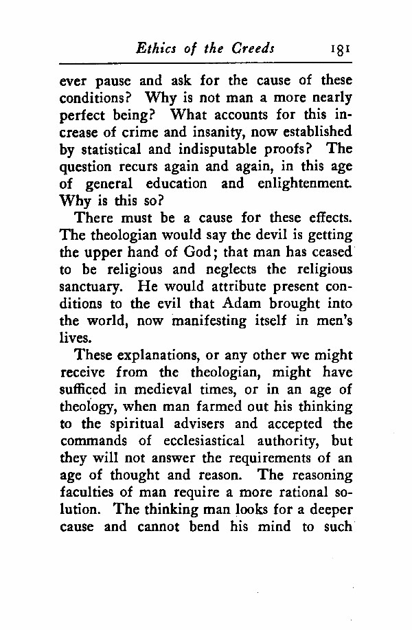 These explanations, or any other we might receive from the theologian, might have sufficed in medieval times, or in an age of theology, when man farmed out his thinking to the spiritual advisers and accepted the commands of ecclesiastical authority, but they will not answer the requirements of an age of thought and reason. The reasoning faculties of man require a more rational solution. The thinking man looks for a deeper cause and cannot bend his mind to such
