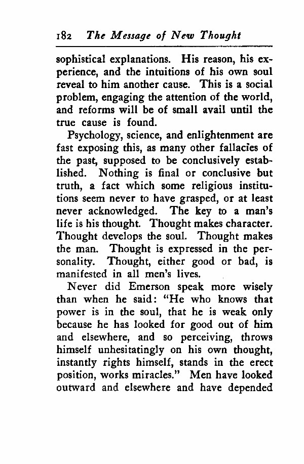 Never did Emerson speak more wisely than when he said: "He who knows that power is in the soul, that he is weak only because he has looked for good out of him and elsewhere, and so perceiving, throws himself unhesitatingly on his own thought, instantly rights himself, stands in the erect position, works miracles." Men have looked outward and elsewhere and have depended