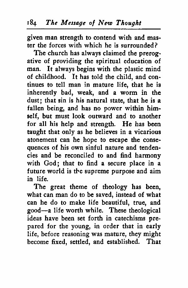 The church has always claimed the prerogative of providing the spiritual education of man. It always begins with the plastic mind of childhood. It has told the child, and continues to tell man in mature life, that he is inherently bad, weak, and a worm in the dust; that sin is his natural state, that he is a fallen being, and has no power within himself, but must look outward and to another for all his help and strength. He has been taught that only as he believes in a vicarious atonement can he hope to escape the consequences of his own sinful nature and tendencies and be reconciled to and find harmony with God; that to find a secure place in a future world is the supreme purpose and aim in life.