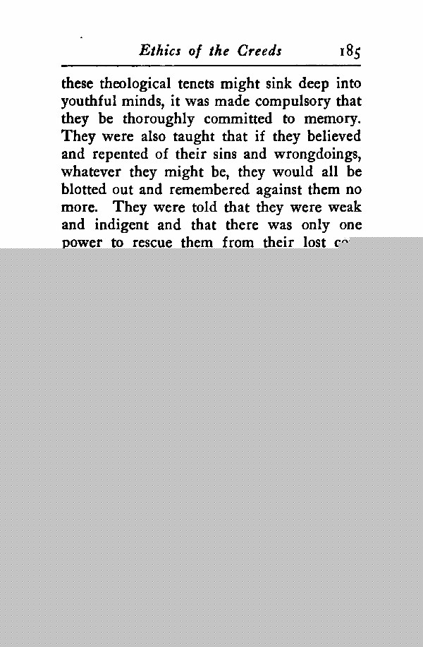 these theological tenets might sink deep into youthful minds, it was made compulsory that they be thoroughly committed to memory. They were also taught that if they believed and repented of their sins and wrong- doings, whatever they might be, they would all be blotted out and remembered against them no more. They were told that they were weak and indigent and that there was only one power to rescue them from their lost condition, and that was in repentance and a belief in the vicarious atonement.
