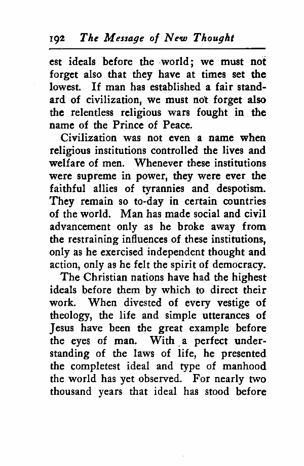 Civilization was not even a name when religious institutions controlled the lives and welfare of men. Whenever these institutions were supreme in power, they were ever the faithful allies of tyrannies and despotism. They remain so today in certain countries of the world. Man has made social and civil advancement only as he broke away from the restraining influences of these institutions, only as he exercised independent thought and action, only as he felt the spirit of democracy.