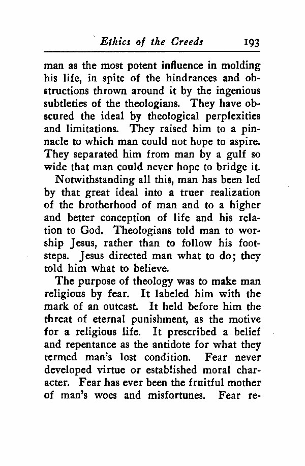 man as the most potent influence in molding his life, in spite of the hindrances and obstructions thrown around it by the ingenious subtleties of the theologians. They have obscured the ideal by theological perplexities and limitations. They raised him to a pinnacle to which man could not hope to aspire. They separated him from man by a gulf so wide that man could never hope to bridge it.