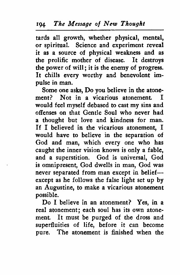 Someone asks, Do you believe in the atonement? Not in a vicarious atonement. I would feel myself debased to cast my sins and offenses on that Gentle Soul who never had a thought but love and kindness for man. If I believed in the vicarious atonement, I would have to believe in the separation of God and man, which everyone who has caught the inner vision knows is only a fable, and a superstition. God is universal, God is omnipresent, God dwells in man, God was never separated from man except in belief--except as he follows the false light set up by an Augustine, to make a vicarious atonement possible.