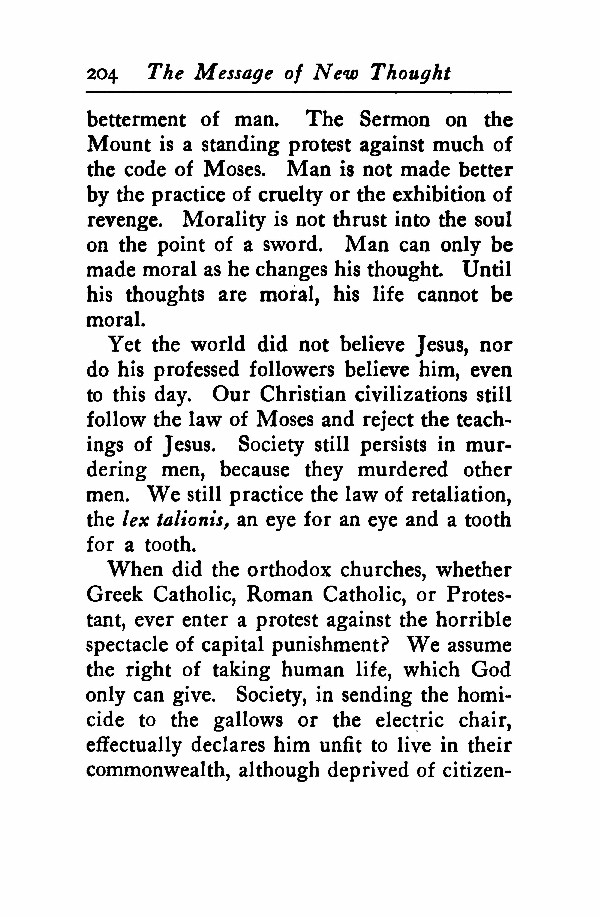betterment of man. The Sermon on the Mount is a standing protest against much of the code of Moses. Man is not made better by the practice of cruelty or the exhibition of revenge. Morality is not thrust into the soul on the point of a sword. Man can only be made moral as he changes his thought. Until his thoughts are moral, his life cannot be moral.