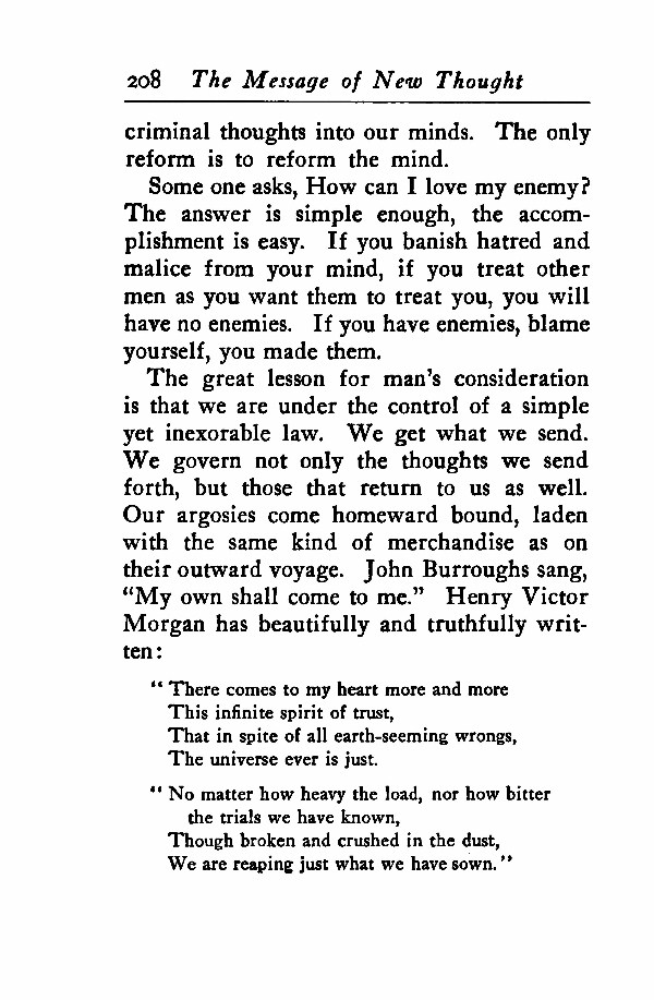 The great lesson for man's consideration is that we are under the control of a simple yet inexorable law. We get what we send. We govern not only the thoughts we send forth, but those that return to us as well. Our argosies come homeward bound, laden with the same kind of merchandise as on their outward voyage. John Burroughs sang, "My own shall come to me." Henry Victor Morgan has beautifully and truthfully written: