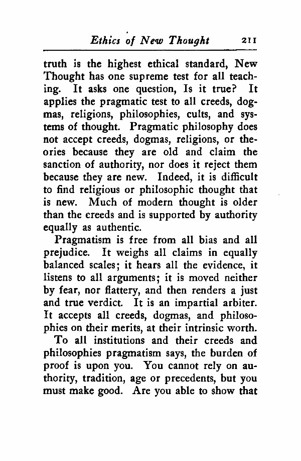 truth is the highest ethical standard, New Thought has one supreme test for all teaching. It asks one question, Is it true? It applies the pragmatic test to all creeds, dogmas, religions, philosophies, cults, and systems of thought. Pragmatic philosophy does not accept creeds, dogmas, religions, or theories because they are old and claim the sanction of authority, nor does it reject them because they are new. Indeed, it is difficult to find religious or philosophic thought that is new. Much of modern thought is older than the creeds and is supported by authority equally as authentic.